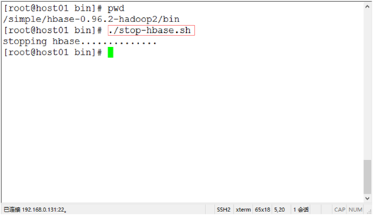 在目录$HBASE/bin下执行命令./stop-hbase.sh,可以停止hbase服务。如下图14所示。