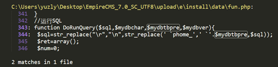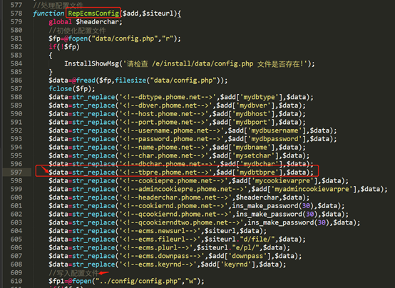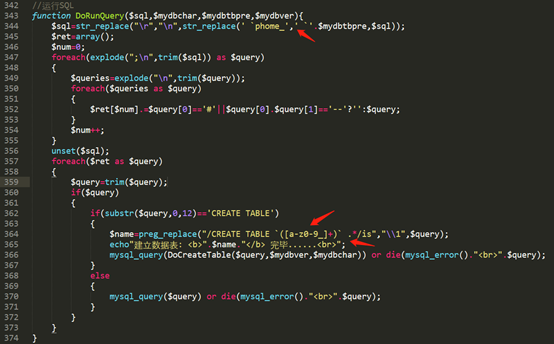 1、漏洞出现位置如下图,phome_表前缀没有被严格过滤导致攻击者构造恶意的代码