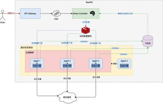 压测集群与压力调控中心之间存在一个反馈渠道,这样压力调控中心就可以知道调控的效果,并根据反馈数据,对下一步的调控进行决策。
