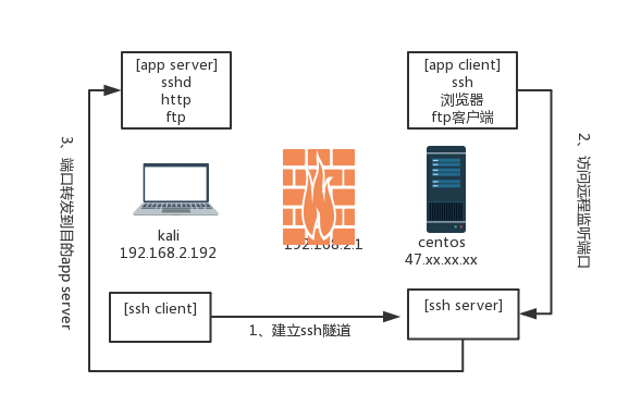 - kali建立ssh隧道:ssh -Nfg -R <ssh_server_forward_port>:<app_server_ip>:<app_server_port> root@<ssh_server_ip> -p <ssh_server_port>