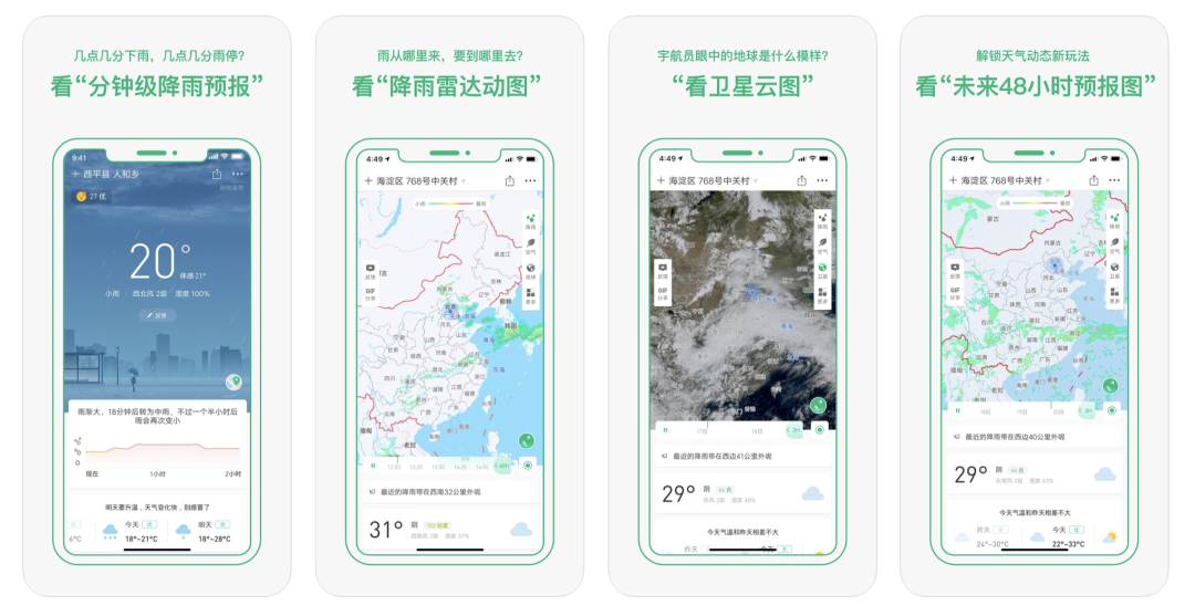 【彩云天气】,大多数天气应用都是显示未来几天某个城市的天气情况,它可以定位你所在地多少分钟之后下雨,多少分钟之后停雨,精度比较高。