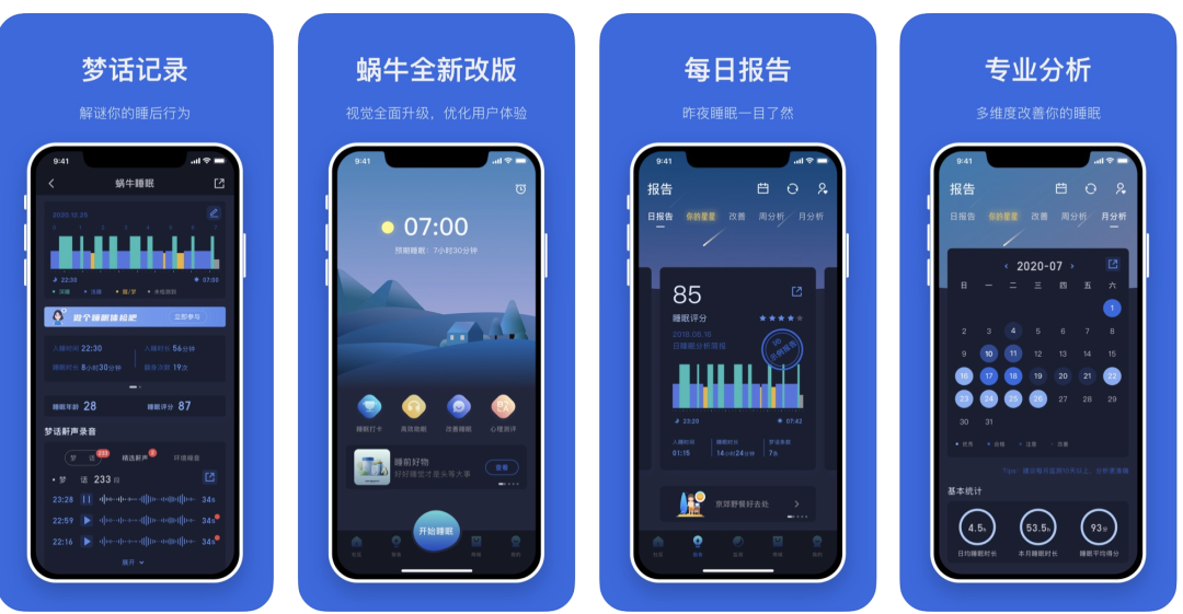 【蜗牛睡眠】,记录你的睡眠状态,什么时候浅睡/深睡,说了什么梦话,每天都给你出一个分析报告。