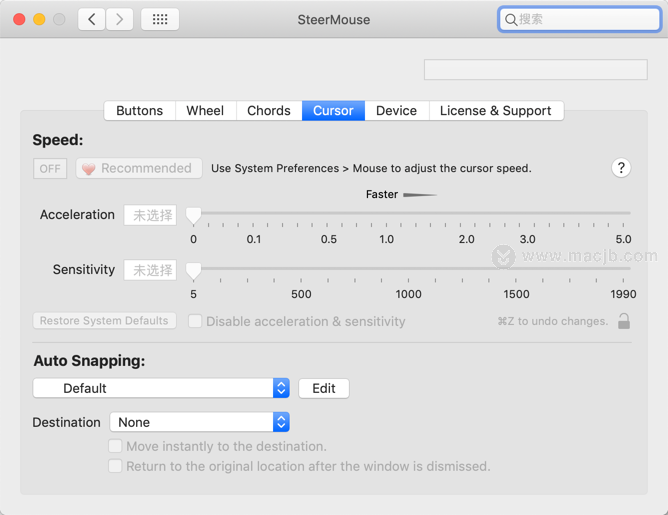 系统偏好设置仅允许调整跟踪速度。SteerMouse可以在此基础上调整灵敏度。通过调整这两个值,您可以像移动手一样移动光标。