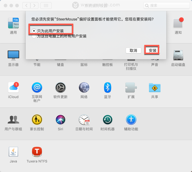 下载软件完成后,打开软件包,双击安装包【SteerMouse.prefPane】进行安装.