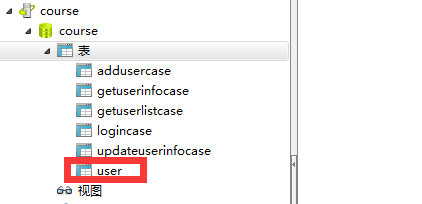 二、本次项目需要涉及到mysql数据库操作,因此先新建数据库、新建表,并添加表字段,如下图course数据库中新建了user表