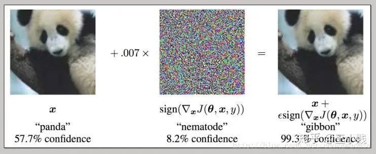 不可解释同样也意味着危险,事实上很多领域对深度学习模型应用的顾虑除了模型本身无法给出足够的信息之外,也有或多或少关于安全性的考虑。比如,下面一个非常经典的关于对抗样本的例子,对于一个CNN模型,在熊猫的图片中添加了一些噪声之后却以99.3%的概率被判定为长臂猿。
