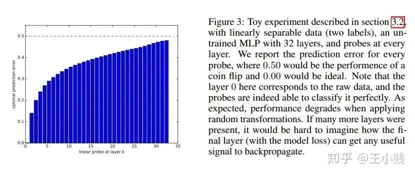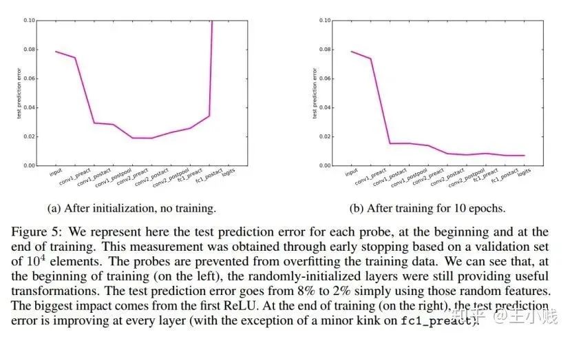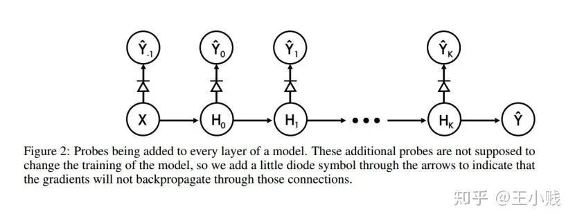 对于神经网络来说,隐层的数量永远都是一个玄学,我们如何理解隐层的数量和模型性能之间的关系呢?Bengio在2016年还做过一个工作《Understanding intermediate layers using linear classifier probes》。这篇文章的思路非常简单,就是通过在每个隐层中添加一个线性探针来测试隐层的表征性能。什么是线性探针呢?也很简单,就是以每个隐藏层为输入,判别的label为输出建立一个逻辑回归模型,通过评估模型的准确率我们就能得到隐层在整个训练过程中以及训练结束之后表征性能的变化。