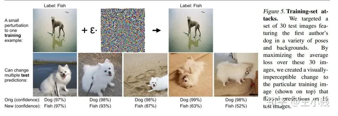 而由于计算出了对训练样本施加轻微扰动之后对特定测试样本损失函数的影响,所以这个方法也可以应用到对抗样本的生成中,只需要在一部分影响力函数较大的样本中添加一些肉眼不可见的扰动,就足以干扰其他样本的判定结果。