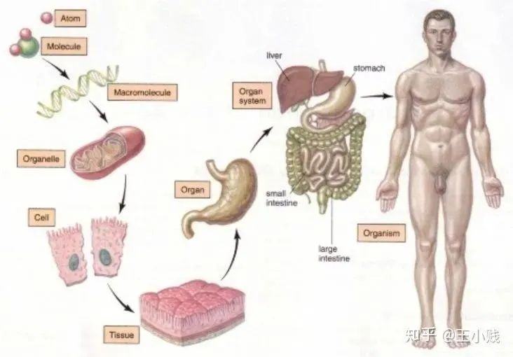 通过上一节的介绍我们也了解到,深度学习的黑箱性主要来源于其高度非线性性质,每个神经元都是由上一层的线性组合再加上一个非线性函数的得到,我们无法像理解线性回归的参数那样通过非常solid的统计学基础假设来理解神经网络中的参数含义及其重要程度、波动范围。但实际上我们是知道这些参数的具体值以及整个训练过程的,所以神经网络模型本身其实并不是一个黑箱,其黑箱性在于我们没办法用人类可以理解的方式理解模型的具体含义和行为,而神经网络的一个非常好的性质在于神经元的分层组合形式,这让我们可以用物质组成的视角来理解神经网络的运作方式。比如如下图所示,人体的组成过程是从分子-细胞-组织-器官-系统-人体: