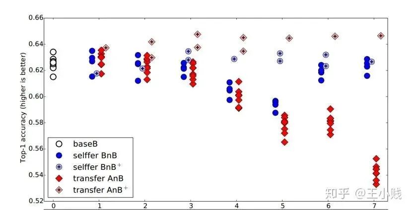 而从实验结果来看,transferAnB的随着层数的增加性能在不断下降(泛化降低,特化提升,这印证了我们对泛化特化性质随层数变化的基本判断),而控制组的selfferBnB的性能出现了先下降后上升的现象(泛化和特化都不足够的中间层既缺乏可学习性,特征的描述性又不够强,因而出现了性能下降的现象),transferBnB+和transferAnB+一直维持着比较好的性能,但其中transferAnB+的性能确是最好的,特征在迁移任务上表现出来的优势其实也对应了我们在上一节中讲的模型本身也意味着知识。