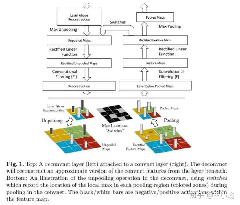 往往可以表示为卷积层对输入层的梯度,也就是说通过对卷积层进行适当的补0操作,再用原始的卷积核转置之后的卷积核进行卷积操作,就可以得到相应的梯度矩阵与当前卷积层的乘积,而我们在这里使用反池化-反激活之后的特征(其中包含了大部分为0的数值)进行该操作其实表征了