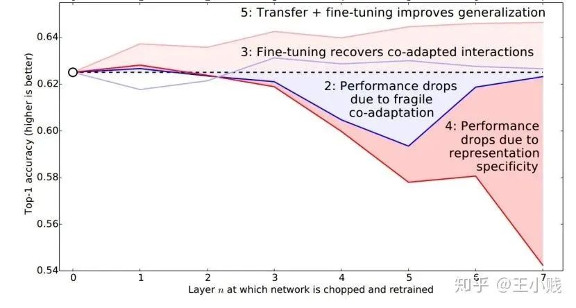 当然从低级概念到高级概念的一个过程中总是会伴随着一个非常有意思的现象:泛化性逐渐降低,特化性逐渐升高。比如在细胞层次上,人类和其他动物的区别比较小,这个层次的泛化性就高,但到组织器官层次区别就比较大,这个层次的特化性就高。Bengio团队在2014年发表的一篇工作《How transferable are features in deep neural networks》就是通过研究特征的可迁移性来对这个从泛化的特化的过程进行评估。