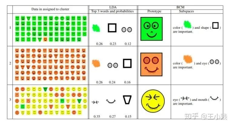 主要是通过一些代表性的样本来解释聚类/分类结果的方法。比如下图所展示的贝叶斯实例模型(Bayesian Case Model,BCM),我们将样本分成三个组团,可以分别找出每个组团中具有的代表性样例和重要的子空间。比如对于下面第一类聚类来说,绿脸是具有代表性的样本,而绿色、方块是具有代表性的特征子空间。