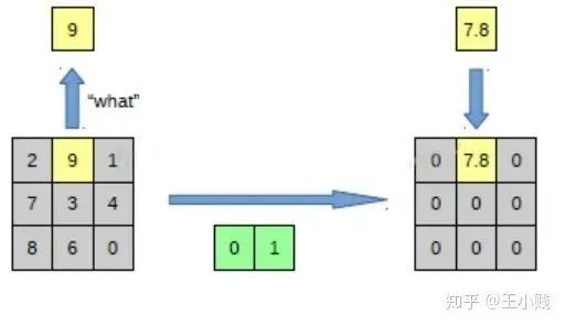 反池化其实很好理解,以下面的图片为例,左图可以表示是池化(pooling)过程,右图表示反池化(unpooling)过程,池化过程中我们将3*3的一个pooling块中的最大值取出,而反池化则是将pooling后的值恢复成3*3的像素单元,由于我们现在只有一个激活值, 所以只将该激活值对应原pooling块中位置的值还原回去,其他的值设定成0。所以在max-pooling的时候,我们不光要知道pooling值,同时也要记录下pooling值的对应位置,比如下图pooling值的位置就是(0,1)。
