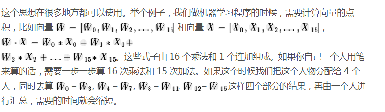 在刚刚的向量点积例子里,4个人同时计算向量的一小段点积,就是通过并行提高这部分的计算性能,