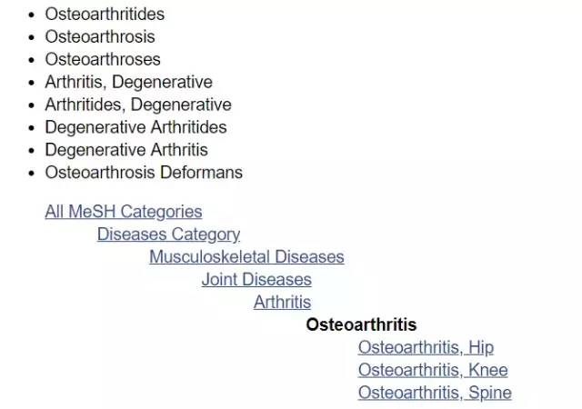 但值得注意的是,正如我们之前讲的根据不同的检索目的调整检索策略,由于主题词归类是数据库后台人工标引的,因此最新的文献是主题词检索不到的,因此我们如果不需要最新文献的话,则可以利用主题检索获取文献,如果要获取全面的文献的话则需要考虑将"Osteoarthritides".,"Osteoarthrosis", "Osteoarthroses"等词汇再进行Tittle/Abstract检索并与主题检索合并,以此获取最全的文献检索结果。