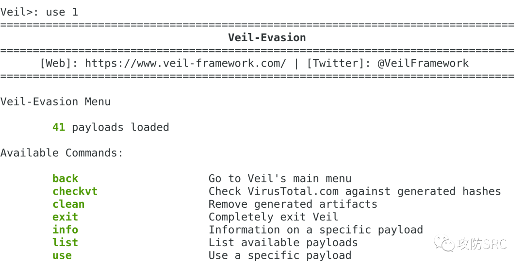 可以看到Veil里总共有41种payload,我们输入list查看所有payload