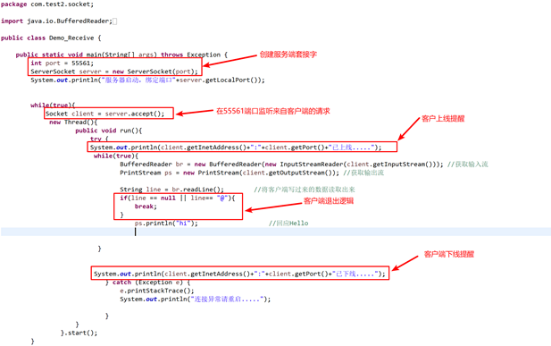 socket通常开发的是客户端,用来让客户端通过端口号和IP地址连接到远程服务器。而ServerSocket实现的则是一个服务器应用,ServerSocket会一直等待客户端的请求,一旦获得了一个连接请求,就创建一个socket示例来与客户端进行通信。ServerSocket会绑定一个固定的端口,知晓此端口和远程服务器的客服端可以通过IP地址和端口号来与远程客户端通信,而服务端的端口则是随机的,在socket的应用中,我们并不关心客户端的端口号。