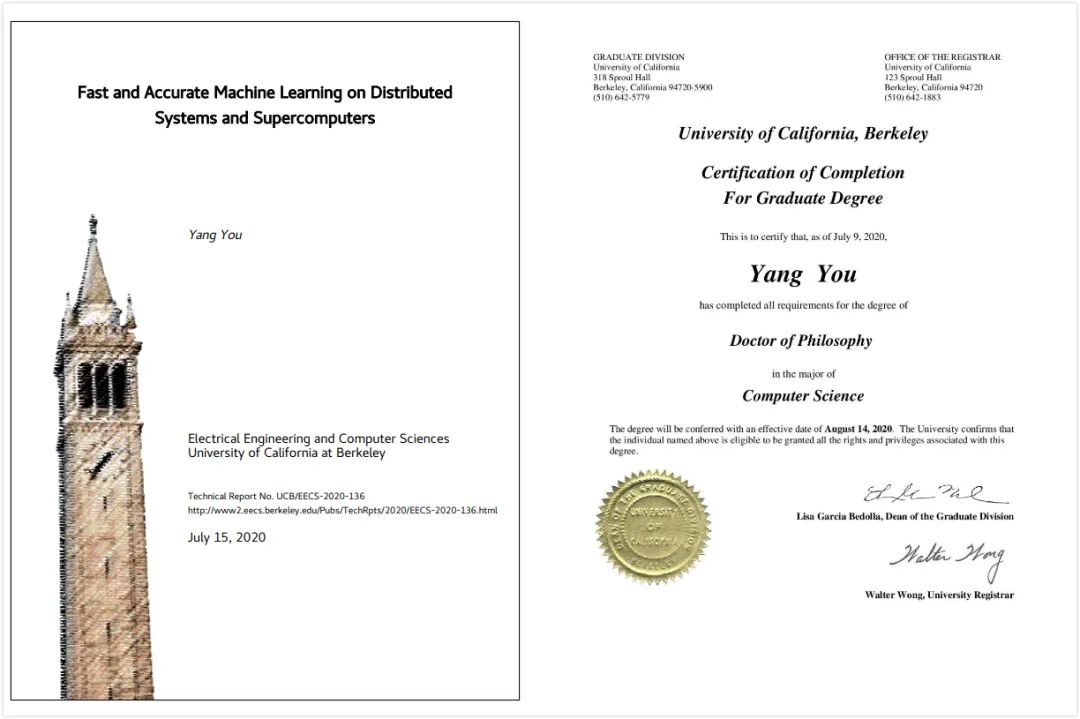 今年 7 月,尤洋从加州大学伯克利分校毕业,获得计算机科学博士学位。目前已入职新加坡国立大学计算机系任助理教授(终身制)。近日,他在社交媒体上介绍了自己的博士论文。