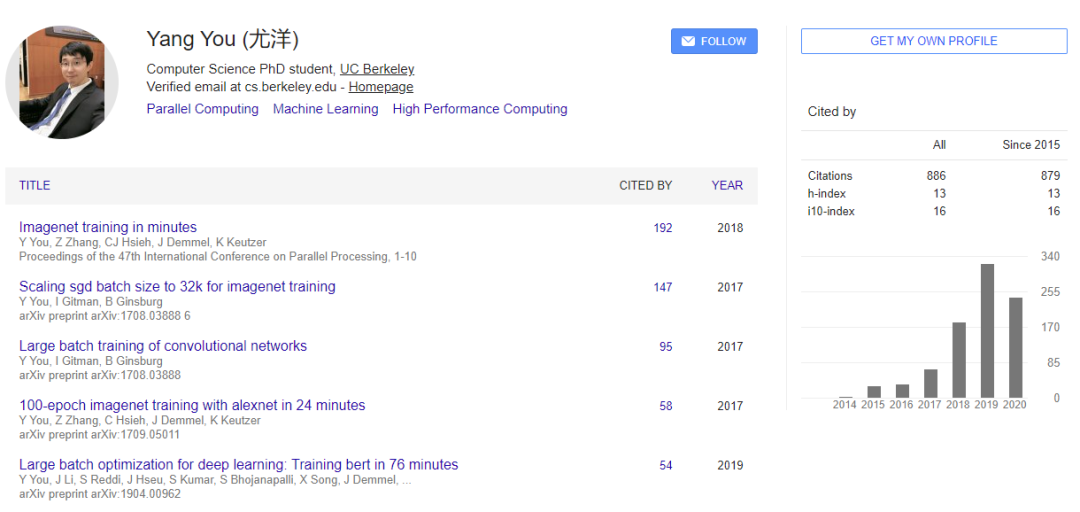 尤洋曾以一作的身份获得 2018 年国际并行处理大会(ICPP)最佳论文奖,论文《Imagenet training in minutes》所提出的方法刷新了 ImageNet 训练速度的世界纪录。