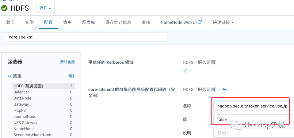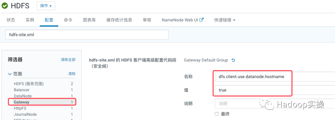 注意:该配置属于HDFS的Gateway角色高级参数,这个配置可以只在集群外客户端的配置文件增, 这里为了统一方便集群配置下发。