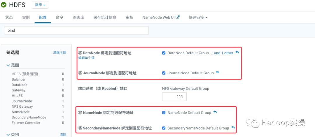 2.在搜索栏输入“bind”勾选如下配置,将各服务的端口号绑定到0.0.0.0