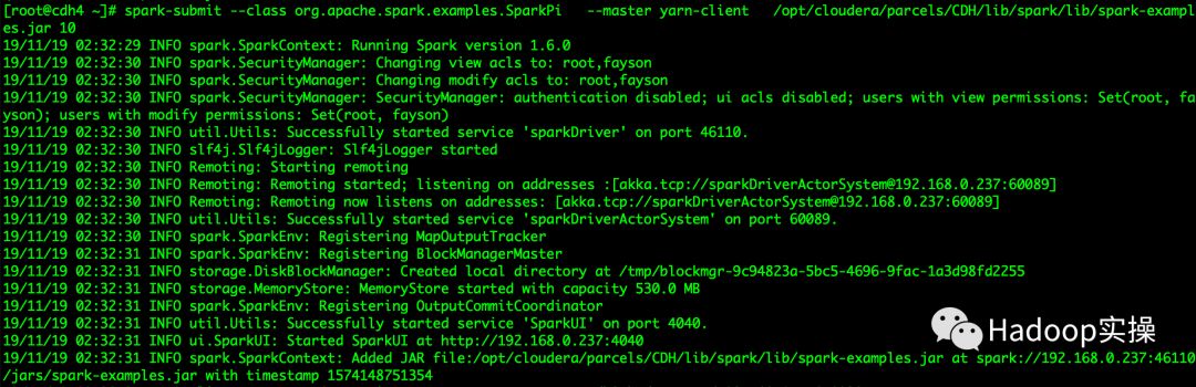 spark-submit --class org.apache.spark.examples.SparkPi --master yarn-client /opt/cloudera/parcels/CDH/lib/spark/lib/spark-examples.jar 10