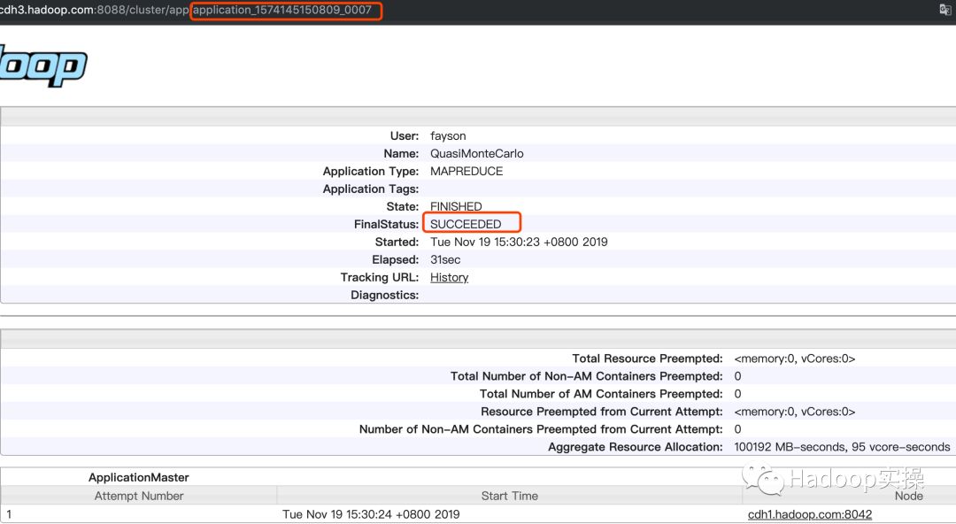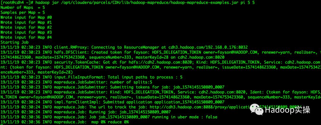 hadoop jar /opt/cloudera/parcels/CDH/lib/hadoop-mapreduce/hadoop-mapreduce-examples.jar pi 5 5