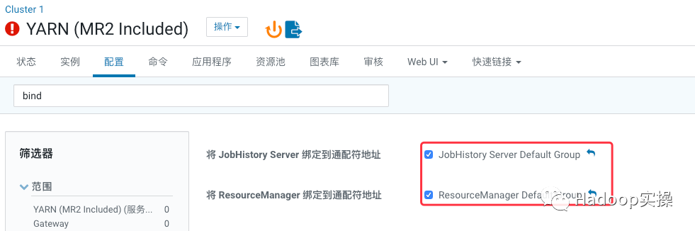 由于需要在集群外客户端跨网段提交MapReduce和Spark作业,需要将Yarn服务的端口号绑定到0.0.0.0,根据如下操作修改Yarn配置。
