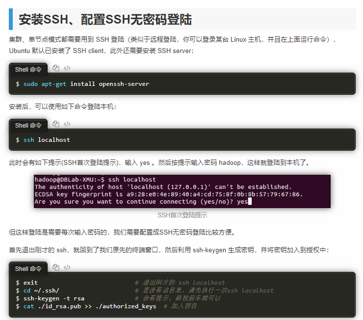 首先,安装软件首先看官网教程。但官网的教程是很简单的,比如Hadoop的安装。默认会创建hadoop用户;给hadoop权限;所有都在hadoop用户下操作(不然会出错);会更新apt;会解压;会配JAVA_HOME,会配置SSH免密登陆。但我是个小白啊,都不懂,因此查了很多资料。不过这些都是Linux基础,我现在得记住这些。