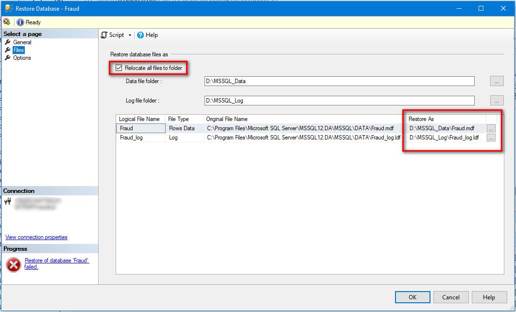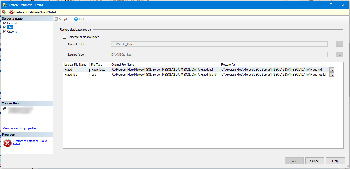 可以看到,数据库Fraud由于备份前是在路径(Original File Name)C:\Program Files\Microsoft SQL Server\MSSQL12.DA\MSSQL\DATA\下的,而这个路径是数据库Fraud备份前所在服务器的地址。但是现在SQL Server Management Studio(SSMS)还原这个数据库时,也将数据库文件Fraud.mdf和日志文件Fraud_log.ldf还原到路径(Restore As)C:\Program Files\Microsoft SQL Server\MSSQL12.DA\MSSQL\DATA\下,那肯定是错误的,因为这个路径是备份前数据库Fraud所在服务器的地址,并不是当前我们还原这个数据库所在服务器的地址。