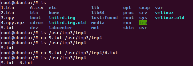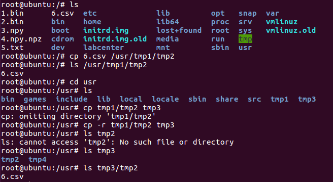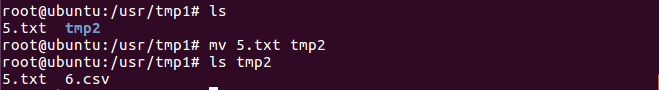 这里,首先将/usr下的6.csv文件复制一份到/usr/tmp1/tmp2中,然后尝试将tmp2目录复制到tmp3中,未加-r参数时,报错,无法拷贝。增加-r参数后,拷贝成功,而且可以看到,是连目录中的文件一起拷贝的。 ###(7)移动目录:mv