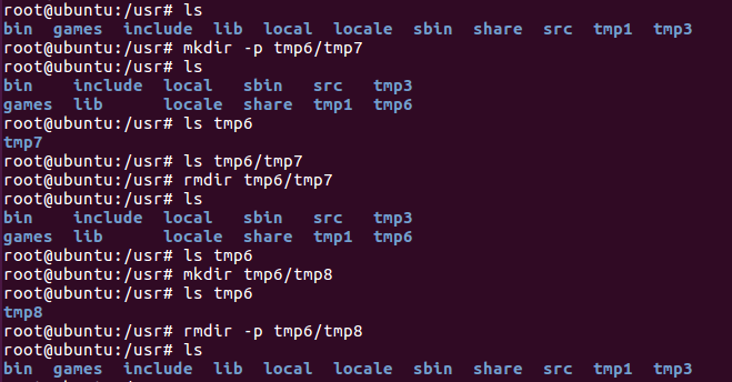 在/usr中递归创建一个新目录tmp6/tmp7,使用rmdir删除tmp7时,只会将tmp7删除,保留了其父目录tmp6;如果使用了-p参数,就会将其父目录tmp6一并删除,如例中删除tmp8时。