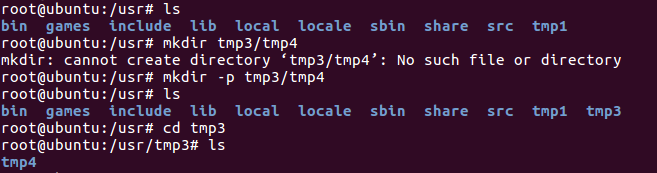 -p的作用是,不使用-p参数时,如果要创建的目录所在的上层目录不存在时,就会报错;而使用了-p参数后,就会直接一次性连上层目录都创建了。如下:创建tmp3中的tmp4,其中tmp3之前是不存在的。未使用-p时,提示了tmp3不存在;使用-p时,不提示错了,tmp3、tmp4都会一次性创建。