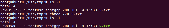 为方便权限的修改,将权限用数字表示,r:4,w:2,x:1,-:0,三个权限组的值拼接在一起,比如:上面的rw-r--r--,第一个权限组:rw-等于4+2+0=6,第二个权限组:r--等于4+0+0=4,第三个权限组:r--等于4+0+0=4,所以其权限值为644。 同样,使用-R参数,实现级联更改。 在linux系统中,默认一个目录的权限为 755,而一个文件的默认权限为644。 -rwxrwx---用数字表示就是770,下面我们通过chmod命令将5.txt文件进行权限修改。