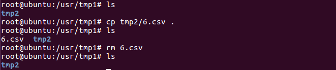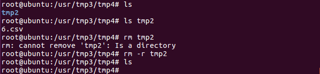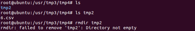 但是当要删除了目录非空时,比如tmp2中有6.csv文件时,再使用rmdir删除它时就会报错。这时候就需要使用rm命令了。