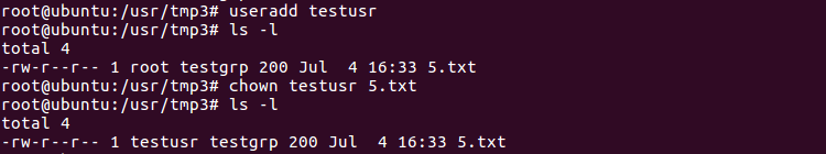 首先使用useradd命令增加一个用户testusr,接着使用chown将文件5.txt的所属主更改为这个用户。 当修改目录时,需要注意,使用-R参数,实现级联更改,即不仅修改该目录,还修改这个目录下面的所有子目录或者文件。-R只对修改目录有效。 ###(4)更改用户操作权限:chmod