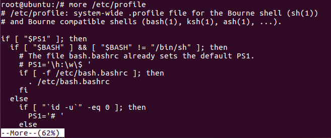 ###(5)查看更多文件内容:more、less 当文件内容太多,一屏不能显示完,如果用cat就只能显示最后面的部分,这时候就需要用more或者less了。 more看完一屏后,就可以通过空格(打印下一屏)、或者回车键(打印下一行),可以随时通过q结束浏览模式。