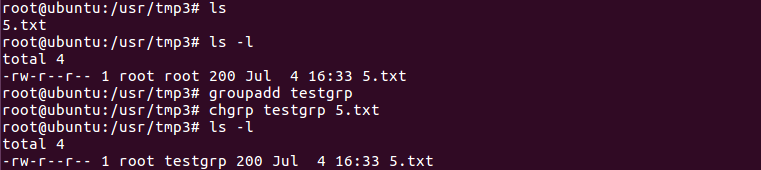 首先使用groupadd命令增加一个组testgrp,接着使用chgrp将文件5.txt的所属组更改为这个组。