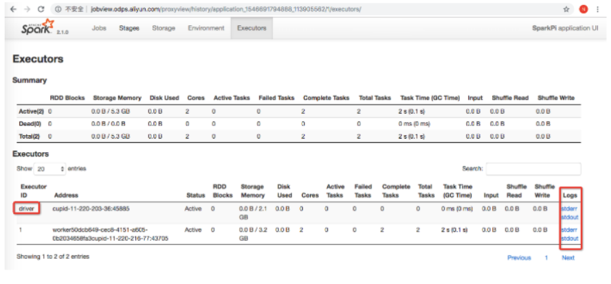 - 日志中打印出上述的TrackingUrl,表示您的作业已经提交到MaxCompute集群,这个TrackingUrl非常关键,它既是SparkWebUI,也是HistoryServer的Url。在浏览器中打开这个Url,可以追踪Spark作业的运行情况。