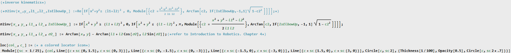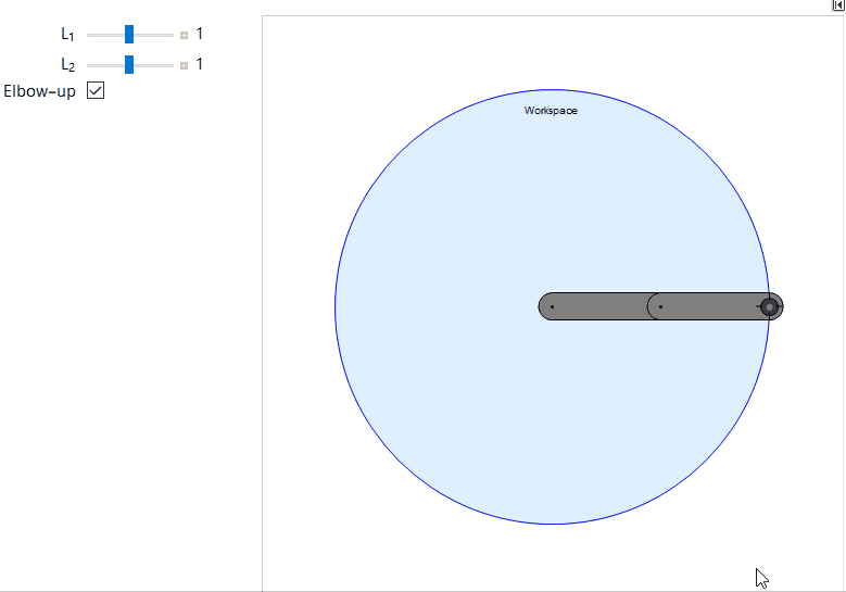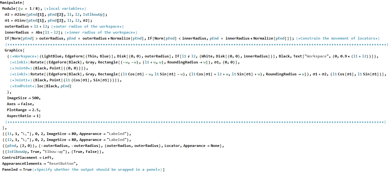 编写Mathematica代码进行平面二杆机械臂运动模拟,使用Locator来改变工作空间中机械臂末端的目标位置。