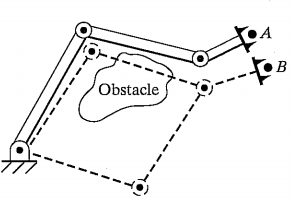 如果逆运动学有多个解,那么控制程序在运行时就必须选择其中一个解,然后发给驱动器驱动机器人关节旋转或平移。如何选择合适的解有许多不同的准则,其中一种比较合理的方法就是选择“最近”的解(the closest solution)。如下图所示,如果机器人在A点,并期望运动到B点,合理的解是关节运动量最小的那一个(A good choice would be the solution that minimizes the amount that each joint is required to move)。因此在不存在障碍物的情况下,上面的虚线构型会被选为逆解。在计算逆解时我们可以考虑将当前位置作为输入参数,这样我们就可以选择关节空间中离当前位置最近的解。