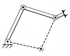 为了保证三角形存在(三角形两边之和大于第三边),即x2+y2−−−−−−√x2+y2 必须小于或等于连杆长度之和l1+l2l1+l2 。在求逆解时需要验证是否满足这一条件,判断解的存在性。另一个可能的解(虚线所示)与之对称,θ′2=−θ2θ2′=−θ2