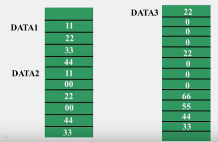 $$ \begin{array}{l}{\text { DATAI DB } 11 \mathrm{H} \text { , 22 H, 33H, 44H }} \ {\text { DATA2 DW } 11 \mathrm{H}, 22 \mathrm{H}, 3344 \mathrm{H}} \ {\text { DATA3 DD } 11 \mathrm{H}^{*} 2,22 \mathrm{H}, 33445566 \mathrm{H}}\end{array} $$