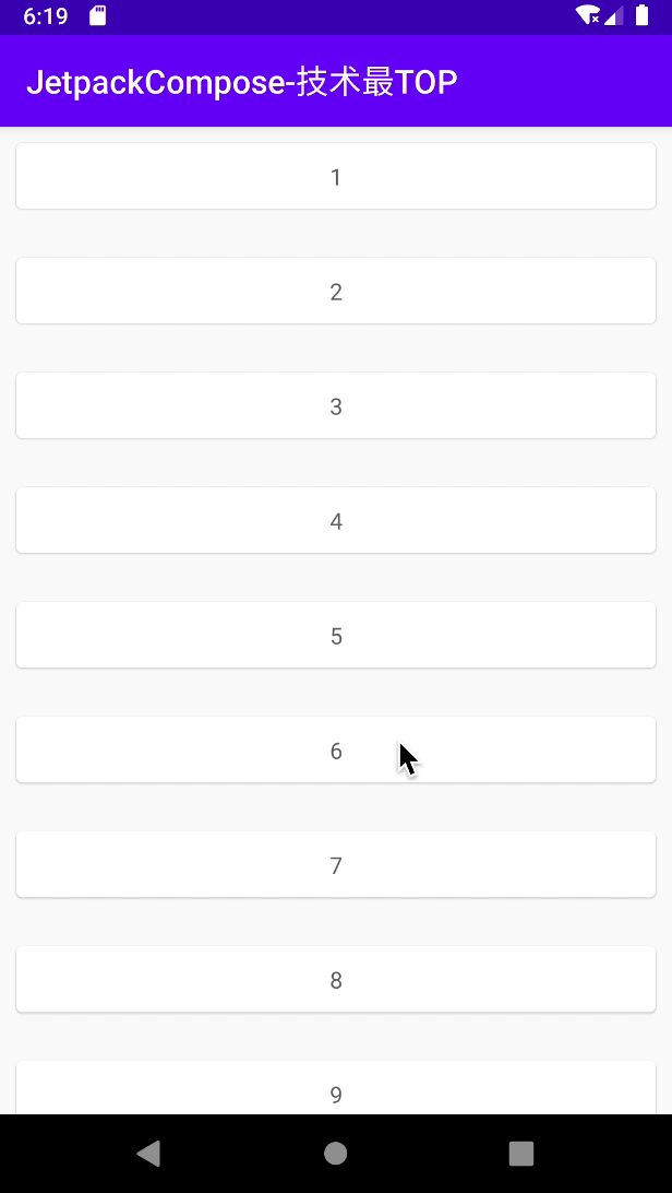 看到了没,就是这样几行代码,我们的列表就完成了,解释一下代码:最开始的准备数据没啥说的,向list中添加了100个数据,然后将数据源传给AdapterList,列表的每一个Item是一个卡片,用的是Card组件,卡片里展示了一个Text文本,最后的Spacer用来设置item之间的间距,相当于ItemDecoration,看一下效果:
