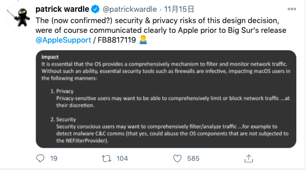 前美国国家安全局(NSA)黑客 Patrick Wardle 也确认说:“的确是这样的... 以前的 macOS 版本允许使用网络内核扩展来设置防火墙或 VPN,但 Big Sur 却不是这样。现在他们自己的应用程序 / 守护程序可以绕过这种过滤机制。“