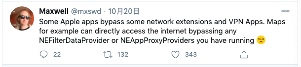 其实早在今年 10 月份,Big Sur Beta 版用户 Maxwell 就在 Twitter 上指出了这个问题:“一些苹果应用程序能绕过某些网络过滤扩展和 VPN 应用。例如,地图可以绕过正在运行的任何 NEFilterDataProvider 或 NEAppProxyProviders 直接访问互联网。”