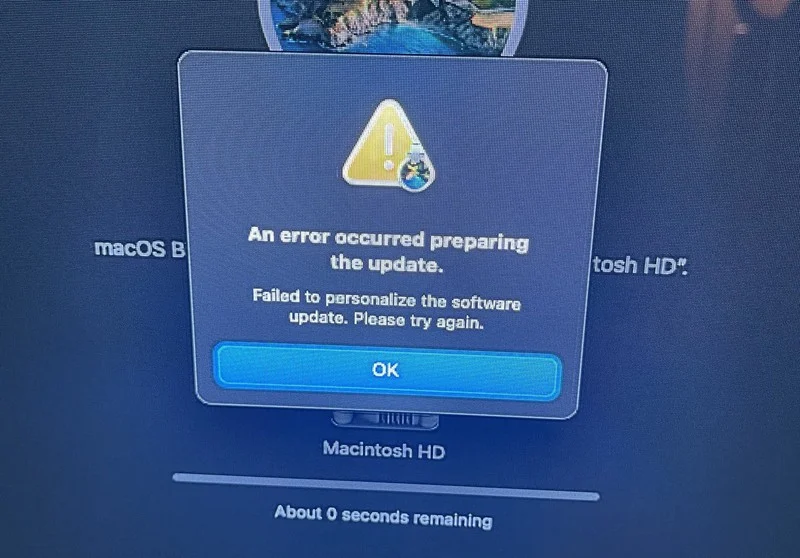 除此之外,M1 芯片的早期使用者也指出了一些问题。一位购买了 M1 Mini 的用户在尝试还原计算机时发现了一个问题,这导致该计算机无法正常工作并一直停留在错误屏幕上,并弹出提示“错误:准备更新时发生错误。无法个性化软件更新。”