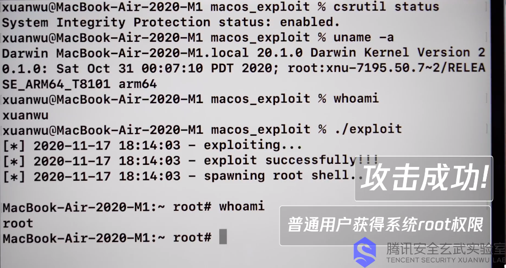 在玄武实验室发布的漏洞利用演示视频中,在 MacBook(设备型号:M1 MacBook Air 2020,macOS Big Sur 11.0.1)上,攻击者在打开所有系统保护的情况下,在一秒之内获取到了系统的最高权限(root 身份),从而可以任意读写设备中存储的通讯录、照片、文件等用户隐私。