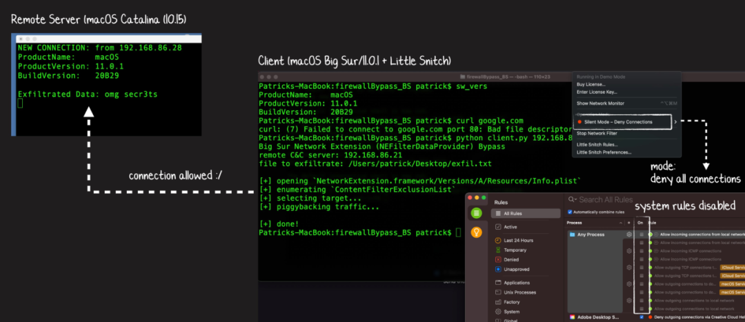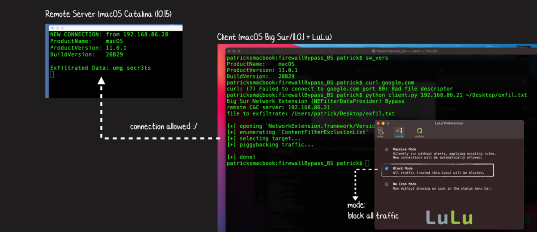 他设置了 Lulu 和 Little Snitch 来阻止 Big Sur 上传出的流量,然后运行了一个小型编程脚本,该 Python 脚本代码利用漏洞与苹果豁免的一个应用程序进行交互,可以轻松地控制服务器。这意味着黑客可以利用 Big Sur 上的漏洞将用户的个人数据发送到远程服务器。